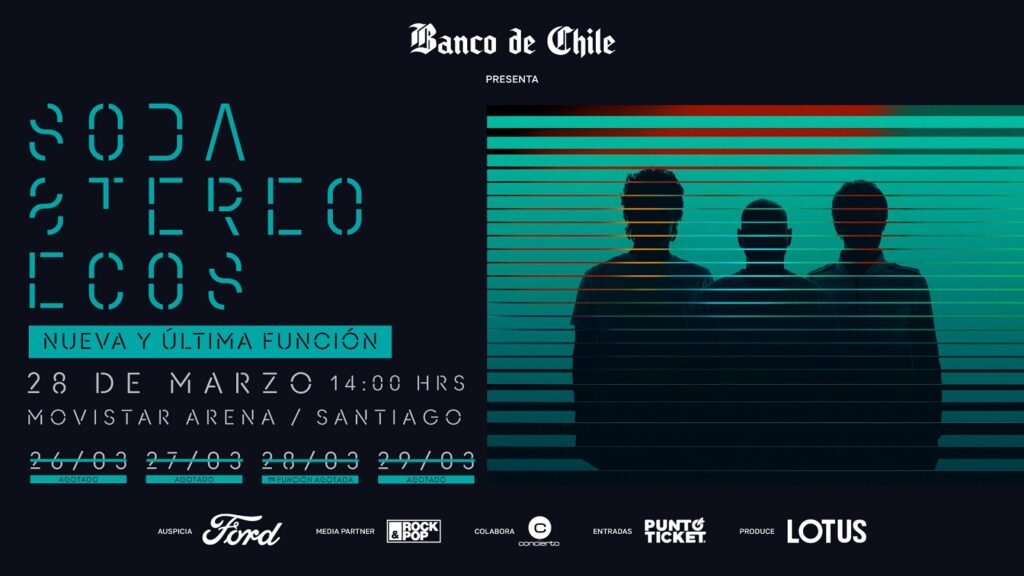 Santiago, 18 de marzo de 2026. El espectáculo de Soda Stereo Ecos, suma una nueva y última función en Santiago. El sábado 28 de marzo tendrá doble función; la primera será a las 14 horas. Las entradas para esta nueva función estarán a la venta el 19 de marzo a las 10 am, iniciando con la Preventa Exclusiva Banco de Chile, mientras que la venta general comenzará el sábado 21 a las 10 am en Puntoticket. Mientras que la segunda función de ese día a las 21 horas se encuentra agotada.